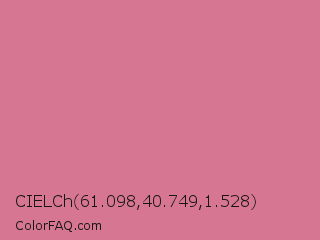 CIELCh 61.098,40.749,1.528 Color is a light rose color and the nearest color is Charm #d47494. Hex code #d67693 and RGB value is rgb(214,118,147). In RGB color space, this color is composed of 84% red, 46% green, 58% blue, In CMYK color space, this color is composed of 0% cyan, 45% magenta, 31% yellow , 16% black , In HSL color space, this color has a hue angle of 342° , 54% saturation and 65% lightness.