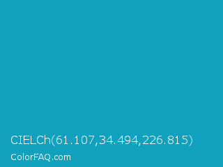 CIELCh 61.107,34.494,226.815 Color is a normal cyan color and the nearest color is Blue Green #0d98ba. Hex code #11a1bf and RGB value is rgb(17,161,191). In RGB color space, this color is composed of 7% red, 63% green, 75% blue, In CMYK color space, this color is composed of 91% cyan, 16% magenta, 0% yellow , 25% black , In HSL color space, this color has a hue angle of 190° , 84% saturation and 41% lightness.