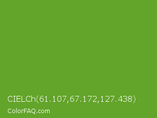 CIELCh 61.107,67.172,127.438 Color is a normal green color and the nearest color is Green RYB #66b032. Hex code #63a42a and RGB value is rgb(99,164,42). In RGB color space, this color is composed of 39% red, 64% green, 16% blue, In CMYK color space, this color is composed of 40% cyan, 0% magenta, 74% yellow , 36% black , In HSL color space, this color has a hue angle of 92° , 59% saturation and 40% lightness.