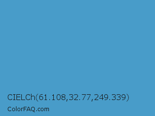 CIELCh 61.108,32.77,249.339 Color is a normal blue color and the nearest color is Celestial Blue #4997d0. Hex code #489cc9 and RGB value is rgb(72,156,201). In RGB color space, this color is composed of 28% red, 61% green, 79% blue, In CMYK color space, this color is composed of 64% cyan, 22% magenta, 0% yellow , 21% black , In HSL color space, this color has a hue angle of 201° , 54% saturation and 54% lightness.