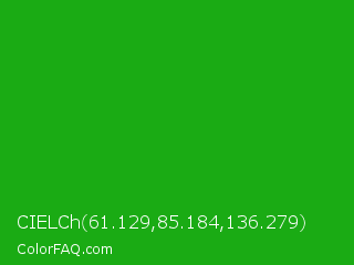 CIELCh 61.129,85.184,136.279 Color is a normal green color and the nearest color is Slimy Green #299617. Hex code #1aab14 and RGB value is rgb(26,171,20). In RGB color space, this color is composed of 10% red, 67% green, 8% blue, In CMYK color space, this color is composed of 85% cyan, 0% magenta, 88% yellow , 33% black , In HSL color space, this color has a hue angle of 118° , 79% saturation and 37% lightness.