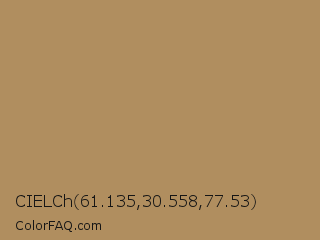 CIELCh 61.135,30.558,77.53 Color is a normal orange color and the nearest color is Teak #b19461. Hex code #b08e5f and RGB value is rgb(176,142,95). In RGB color space, this color is composed of 69% red, 56% green, 37% blue, In CMYK color space, this color is composed of 0% cyan, 19% magenta, 46% yellow , 31% black , In HSL color space, this color has a hue angle of 35° , 34% saturation and 53% lightness.