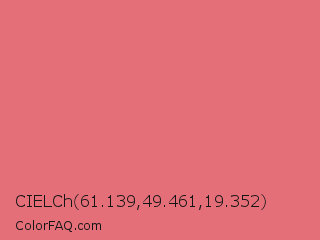 CIELCh 61.139,49.461,19.352 Color is a light red color and the nearest color is Candy Pink #e4717a. Hex code #e56f79 and RGB value is rgb(229,111,121). In RGB color space, this color is composed of 90% red, 44% green, 47% blue, In CMYK color space, this color is composed of 0% cyan, 52% magenta, 47% yellow , 10% black , In HSL color space, this color has a hue angle of 355° , 69% saturation and 67% lightness.