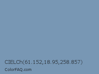 CIELCh 61.152,18.95,258.857 Color is a normal blue color and the nearest color is Weldon Blue #7c98ab. Hex code #7897b4 and RGB value is rgb(120,151,180). In RGB color space, this color is composed of 47% red, 59% green, 71% blue, In CMYK color space, this color is composed of 33% cyan, 16% magenta, 0% yellow , 29% black , In HSL color space, this color has a hue angle of 209° , 29% saturation and 59% lightness.