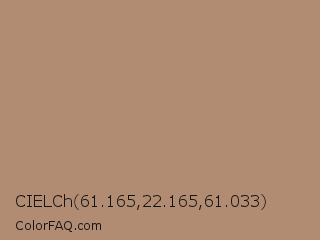 CIELCh 61.165,22.165,61.033 Color is a normal orange color and the nearest color is Light Taupe #b38b6d. Hex code #b28c72 and RGB value is rgb(178,140,114). In RGB color space, this color is composed of 70% red, 55% green, 45% blue, In CMYK color space, this color is composed of 0% cyan, 21% magenta, 36% yellow , 30% black , In HSL color space, this color has a hue angle of 24° , 29% saturation and 57% lightness.