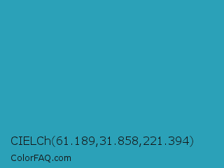 CIELCh 61.189,31.858,221.394 Color is a normal cyan color and the nearest color is Eastern Blue #1e9ab0. Hex code #2ba1b8 and RGB value is rgb(43,161,184). In RGB color space, this color is composed of 17% red, 63% green, 72% blue, In CMYK color space, this color is composed of 77% cyan, 13% magenta, 0% yellow , 28% black , In HSL color space, this color has a hue angle of 190° , 62% saturation and 45% lightness.