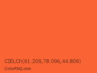 CIELCh 61.209,78.096,44.809 Color is a normal red color and the nearest color is Outrageous Orange Crayola #ff6037. Hex code #fa6333 and RGB value is rgb(250,99,51). In RGB color space, this color is composed of 98% red, 39% green, 20% blue, In CMYK color space, this color is composed of 0% cyan, 60% magenta, 80% yellow , 2% black , In HSL color space, this color has a hue angle of 14° , 95% saturation and 59% lightness.