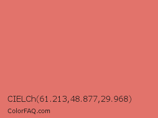 CIELCh 61.213,48.877,29.968 Color is a light red color and the nearest color is Sunglo #e16865. Hex code #e2736b and RGB value is rgb(226,115,107). In RGB color space, this color is composed of 89% red, 45% green, 42% blue, In CMYK color space, this color is composed of 0% cyan, 49% magenta, 53% yellow , 11% black , In HSL color space, this color has a hue angle of 4° , 67% saturation and 65% lightness.