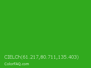 CIELCh 61.217,80.711,135.403 Color is a normal green color and the nearest color is Slimy Green #299617. Hex code #31aa1e and RGB value is rgb(49,170,30). In RGB color space, this color is composed of 19% red, 67% green, 12% blue, In CMYK color space, this color is composed of 71% cyan, 0% magenta, 82% yellow , 33% black , In HSL color space, this color has a hue angle of 112° , 70% saturation and 39% lightness.