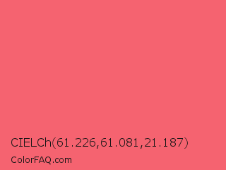 CIELCh 61.226,61.081,21.187 Color is a light red color and the nearest color is Wild Watermelon #fd5b78. Hex code #f56370 and RGB value is rgb(245,99,112). In RGB color space, this color is composed of 96% red, 39% green, 44% blue, In CMYK color space, this color is composed of 0% cyan, 60% magenta, 54% yellow , 4% black , In HSL color space, this color has a hue angle of 355° , 88% saturation and 67% lightness.