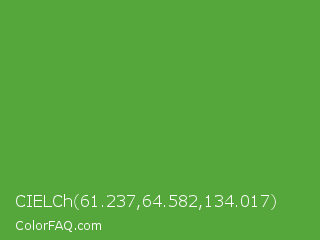 CIELCh 61.237,64.582,134.017 Color is a normal green color and the nearest color is Apple #4fa83d. Hex code #55a63b and RGB value is rgb(85,166,59). In RGB color space, this color is composed of 33% red, 65% green, 23% blue, In CMYK color space, this color is composed of 49% cyan, 0% magenta, 64% yellow , 35% black , In HSL color space, this color has a hue angle of 105° , 48% saturation and 44% lightness.