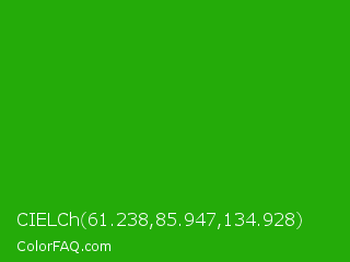CIELCh 61.238,85.947,134.928 Color is a normal green color and the nearest color is Slimy Green #299617. Hex code #24ab09 and RGB value is rgb(36,171,9). In RGB color space, this color is composed of 14% red, 67% green, 4% blue, In CMYK color space, this color is composed of 79% cyan, 0% magenta, 95% yellow , 33% black , In HSL color space, this color has a hue angle of 110° , 90% saturation and 35% lightness.