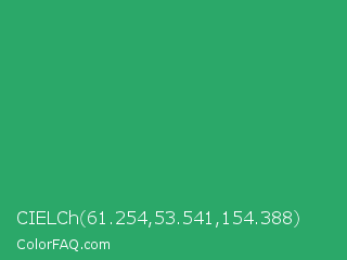 CIELCh 61.254,53.541,154.388 Color is a normal green color and the nearest color is Green Crayola #1cac78. Hex code #2ba869 and RGB value is rgb(43,168,105). In RGB color space, this color is composed of 17% red, 66% green, 41% blue, In CMYK color space, this color is composed of 74% cyan, 0% magenta, 38% yellow , 34% black , In HSL color space, this color has a hue angle of 150° , 59% saturation and 41% lightness.