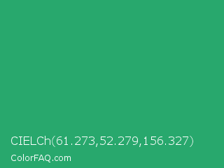 CIELCh 61.273,52.279,156.327 Color is a normal green color and the nearest color is Green Crayola #1cac78. Hex code #28a86d and RGB value is rgb(40,168,109). In RGB color space, this color is composed of 16% red, 66% green, 43% blue, In CMYK color space, this color is composed of 76% cyan, 0% magenta, 35% yellow , 34% black , In HSL color space, this color has a hue angle of 152° , 62% saturation and 41% lightness.