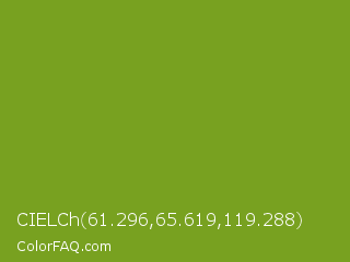 CIELCh 61.296,65.619,119.288 Color is a normal lime color and the nearest color is Christi #67a712. Hex code #78a120 and RGB value is rgb(120,161,32). In RGB color space, this color is composed of 47% red, 63% green, 13% blue, In CMYK color space, this color is composed of 25% cyan, 0% magenta, 80% yellow , 37% black , In HSL color space, this color has a hue angle of 79° , 67% saturation and 38% lightness.