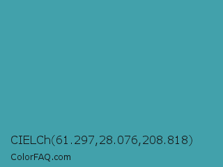 CIELCh 61.297,28.076,208.818 Color is a normal cyan color and the nearest color is Verdigris #43b3ae. Hex code #42a1ab and RGB value is rgb(66,161,171). In RGB color space, this color is composed of 26% red, 63% green, 67% blue, In CMYK color space, this color is composed of 61% cyan, 6% magenta, 0% yellow , 33% black , In HSL color space, this color has a hue angle of 186° , 44% saturation and 46% lightness.