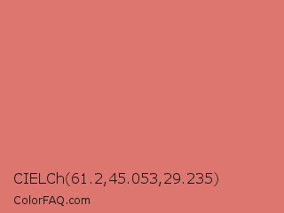 CIELCh 61.2,45.053,29.235 Color is a light red color and the nearest color is Candy Pink #e4717a. Hex code #dd766f and RGB value is rgb(221,118,111). In RGB color space, this color is composed of 87% red, 46% green, 44% blue, In CMYK color space, this color is composed of 0% cyan, 47% magenta, 50% yellow , 13% black , In HSL color space, this color has a hue angle of 4° , 62% saturation and 65% lightness.