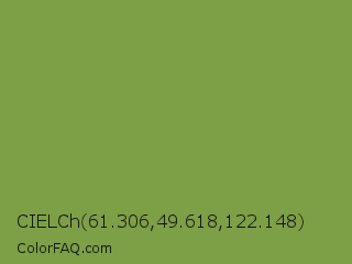 CIELCh 61.306,49.618,122.148 Color is a normal green color and the nearest color is Palm Leaf #6f9940. Hex code #7d9f46 and RGB value is rgb(125,159,70). In RGB color space, this color is composed of 49% red, 62% green, 27% blue, In CMYK color space, this color is composed of 21% cyan, 0% magenta, 56% yellow , 38% black , In HSL color space, this color has a hue angle of 83° , 39% saturation and 45% lightness.
