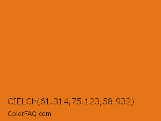 CIELCh 61.314,75.123,58.932 Color is a normal orange color and the nearest color is Tango #ed7a1c. Hex code #e67517 and RGB value is rgb(230,117,23). In RGB color space, this color is composed of 90% red, 46% green, 9% blue, In CMYK color space, this color is composed of 0% cyan, 49% magenta, 90% yellow , 10% black , In HSL color space, this color has a hue angle of 27° , 82% saturation and 50% lightness.
