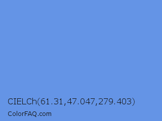 CIELCh 61.31,47.047,279.403 Color is a light blue color and the nearest color is Cornflower Blue #6495ed. Hex code #6494e6 and RGB value is rgb(100,148,230). In RGB color space, this color is composed of 39% red, 58% green, 90% blue, In CMYK color space, this color is composed of 57% cyan, 36% magenta, 0% yellow , 10% black , In HSL color space, this color has a hue angle of 218° , 72% saturation and 65% lightness.
