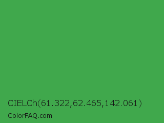 CIELCh 61.322,62.465,142.061 Color is a normal green color and the nearest color is Chateau Green #40a860. Hex code #40a84c and RGB value is rgb(64,168,76). In RGB color space, this color is composed of 25% red, 66% green, 30% blue, In CMYK color space, this color is composed of 62% cyan, 0% magenta, 55% yellow , 34% black , In HSL color space, this color has a hue angle of 127° , 45% saturation and 45% lightness.