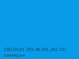 CIELCh 61.355,48.051,262.15 Color is a normal blue color and the nearest color is Vivid Cerulean #00aaee. Hex code #089ce8 and RGB value is rgb(8,156,232). In RGB color space, this color is composed of 3% red, 61% green, 91% blue, In CMYK color space, this color is composed of 97% cyan, 33% magenta, 0% yellow , 9% black , In HSL color space, this color has a hue angle of 200° , 93% saturation and 47% lightness.