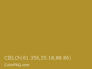 CIELCh 61.356,55.18,88.86 Color is a normal yellow color and the nearest color is Alpine #af8f2c. Hex code #b0912b and RGB value is rgb(176,145,43). In RGB color space, this color is composed of 69% red, 57% green, 17% blue, In CMYK color space, this color is composed of 0% cyan, 18% magenta, 76% yellow , 31% black , In HSL color space, this color has a hue angle of 46° , 61% saturation and 43% lightness.