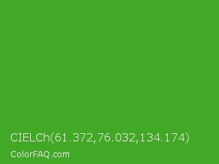 CIELCh 61.372,76.032,134.174 Color is a normal green color and the nearest color is Wageningen Green #34b233. Hex code #42a926 and RGB value is rgb(66,169,38). In RGB color space, this color is composed of 26% red, 66% green, 15% blue, In CMYK color space, this color is composed of 61% cyan, 0% magenta, 78% yellow , 34% black , In HSL color space, this color has a hue angle of 107° , 63% saturation and 41% lightness.