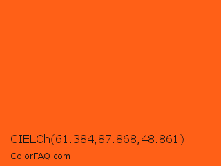 CIELCh 61.384,87.868,48.861 Color is a normal orange color and the nearest color is Giants Orange #fe5a1d. Hex code #ff6017 and RGB value is rgb(255,96,23). In RGB color space, this color is composed of 100% red, 38% green, 9% blue, In CMYK color space, this color is composed of 0% cyan, 62% magenta, 91% yellow , 0% black , In HSL color space, this color has a hue angle of 19° , 100% saturation and 55% lightness.