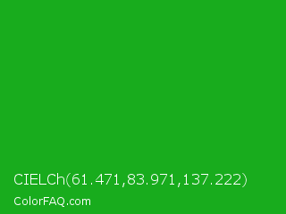 CIELCh 61.471,83.971,137.222 Color is a normal green color and the nearest color is Slimy Green #299617. Hex code #18ac1d and RGB value is rgb(24,172,29). In RGB color space, this color is composed of 9% red, 67% green, 11% blue, In CMYK color space, this color is composed of 86% cyan, 0% magenta, 83% yellow , 33% black , In HSL color space, this color has a hue angle of 122° , 76% saturation and 38% lightness.