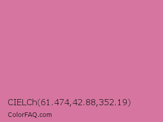 CIELCh 61.474,42.88,352.19 Color is a light rose color and the nearest color is Wild Orchid #d470a2. Hex code #d676a0 and RGB value is rgb(214,118,160). In RGB color space, this color is composed of 84% red, 46% green, 63% blue, In CMYK color space, this color is composed of 0% cyan, 45% magenta, 25% yellow , 16% black , In HSL color space, this color has a hue angle of 334° , 54% saturation and 65% lightness.
