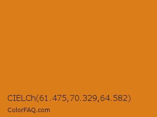 CIELCh 61.475,70.329,64.582 Color is a normal orange color and the nearest color is Meteor #d07d12. Hex code #db7d18 and RGB value is rgb(219,125,24). In RGB color space, this color is composed of 86% red, 49% green, 9% blue, In CMYK color space, this color is composed of 0% cyan, 43% magenta, 89% yellow , 14% black , In HSL color space, this color has a hue angle of 31° , 80% saturation and 48% lightness.