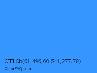 CIELCh 61.496,60.541,277.78 Color is a light blue color and the nearest color is Brilliant Azure #3399ff. Hex code #3696ff and RGB value is rgb(54,150,255). In RGB color space, this color is composed of 21% red, 59% green, 100% blue, In CMYK color space, this color is composed of 79% cyan, 41% magenta, 0% yellow , 0% black , In HSL color space, this color has a hue angle of 211° , 100% saturation and 61% lightness.