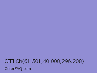 CIELCh 61.501,40.008,296.208 Color is a light indigo color and the nearest color is Blue Bell Crayola #9999cc. Hex code #918dd4 and RGB value is rgb(145,141,212). In RGB color space, this color is composed of 57% red, 55% green, 83% blue, In CMYK color space, this color is composed of 32% cyan, 33% magenta, 0% yellow , 17% black , In HSL color space, this color has a hue angle of 243° , 45% saturation and 69% lightness.