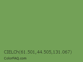 CIELCh 61.501,44.505,131.067 Color is a normal green color and the nearest color is Asparagus Green #7ba05b. Hex code #73a157 and RGB value is rgb(115,161,87). In RGB color space, this color is composed of 45% red, 63% green, 34% blue, In CMYK color space, this color is composed of 29% cyan, 0% magenta, 46% yellow , 37% black , In HSL color space, this color has a hue angle of 97° , 30% saturation and 49% lightness.