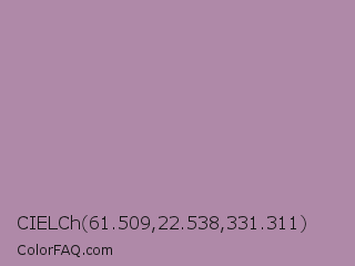 CIELCh 61.509,22.538,331.311 Color is a light magenta color and the nearest color is Opera Mauve #b784a7. Hex code #af89a8 and RGB value is rgb(175,137,168). In RGB color space, this color is composed of 69% red, 54% green, 66% blue, In CMYK color space, this color is composed of 0% cyan, 22% magenta, 4% yellow , 31% black , In HSL color space, this color has a hue angle of 311° , 19% saturation and 61% lightness.