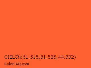 CIELCh 61.515,81.535,44.332 Color is a normal red color and the nearest color is Outrageous Orange Crayola #ff6037. Hex code #ff6030 and RGB value is rgb(255,96,48). In RGB color space, this color is composed of 100% red, 38% green, 19% blue, In CMYK color space, this color is composed of 0% cyan, 62% magenta, 81% yellow , 0% black , In HSL color space, this color has a hue angle of 14° , 100% saturation and 59% lightness.