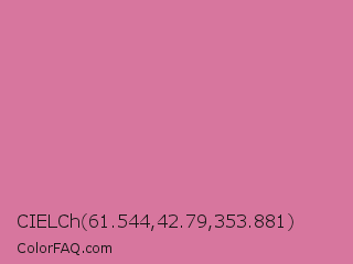 CIELCh 61.544,42.79,353.881 Color is a light rose color and the nearest color is Wild Orchid #d470a2. Hex code #d7769e and RGB value is rgb(215,118,158). In RGB color space, this color is composed of 84% red, 46% green, 62% blue, In CMYK color space, this color is composed of 0% cyan, 45% magenta, 27% yellow , 16% black , In HSL color space, this color has a hue angle of 335° , 55% saturation and 65% lightness.
