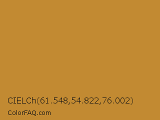 CIELCh 61.548,54.822,76.002 Color is a normal orange color and the nearest color is Marigold #b98d28. Hex code #c28a32 and RGB value is rgb(194,138,50). In RGB color space, this color is composed of 76% red, 54% green, 20% blue, In CMYK color space, this color is composed of 0% cyan, 29% magenta, 74% yellow , 24% black , In HSL color space, this color has a hue angle of 37° , 59% saturation and 48% lightness.