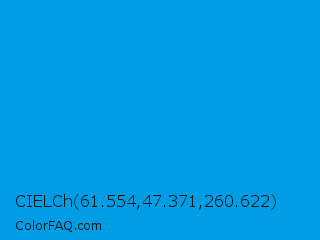 CIELCh 61.554,47.371,260.622 Color is a normal blue color and the nearest color is Vivid Cerulean #00aaee. Hex code #009de7 and RGB value is rgb(0,157,231). In RGB color space, this color is composed of 0% red, 62% green, 91% blue, In CMYK color space, this color is composed of 100% cyan, 32% magenta, 0% yellow , 9% black , In HSL color space, this color has a hue angle of 199° , 100% saturation and 45% lightness.