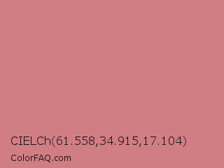 CIELCh 61.558,34.915,17.104 Color is a light red color and the nearest color is New York Pink #d7837f. Hex code #d17d84 and RGB value is rgb(209,125,132). In RGB color space, this color is composed of 82% red, 49% green, 52% blue, In CMYK color space, this color is composed of 0% cyan, 40% magenta, 37% yellow , 18% black , In HSL color space, this color has a hue angle of 355° , 48% saturation and 65% lightness.