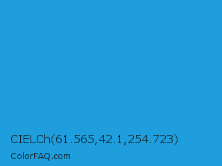 CIELCh 61.565,42.1,254.723 Color is a normal blue color and the nearest color is Battery Charged Blue #1dacd6. Hex code #1e9edc and RGB value is rgb(30,158,220). In RGB color space, this color is composed of 12% red, 62% green, 86% blue, In CMYK color space, this color is composed of 86% cyan, 28% magenta, 0% yellow , 14% black , In HSL color space, this color has a hue angle of 200° , 76% saturation and 49% lightness.