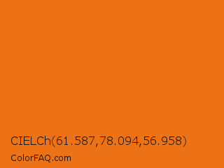 CIELCh 61.587,78.094,56.958 Color is a normal orange color and the nearest color is Tango #ed7a1c. Hex code #ec7215 and RGB value is rgb(236,114,21). In RGB color space, this color is composed of 93% red, 45% green, 8% blue, In CMYK color space, this color is composed of 0% cyan, 52% magenta, 91% yellow , 7% black , In HSL color space, this color has a hue angle of 26° , 85% saturation and 50% lightness.