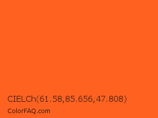 CIELCh 61.58,85.656,47.808 Color is a normal orange color and the nearest color is Orange #ff681f. Hex code #ff6120 and RGB value is rgb(255,97,32). In RGB color space, this color is composed of 100% red, 38% green, 13% blue, In CMYK color space, this color is composed of 0% cyan, 62% magenta, 87% yellow , 0% black , In HSL color space, this color has a hue angle of 17° , 100% saturation and 56% lightness.