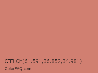 CIELCh 61.591,36.852,34.981 Color is a light red color and the nearest color is New York Pink #d7837f. Hex code #d17f71 and RGB value is rgb(209,127,113). In RGB color space, this color is composed of 82% red, 50% green, 44% blue, In CMYK color space, this color is composed of 0% cyan, 39% magenta, 46% yellow , 18% black , In HSL color space, this color has a hue angle of 9° , 51% saturation and 63% lightness.