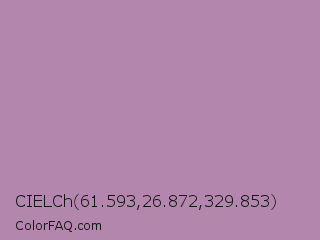 CIELCh 61.593,26.872,329.853 Color is a light magenta color and the nearest color is Opera Mauve #b784a7. Hex code #b387ad and RGB value is rgb(179,135,173). In RGB color space, this color is composed of 70% red, 53% green, 68% blue, In CMYK color space, this color is composed of 0% cyan, 25% magenta, 3% yellow , 30% black , In HSL color space, this color has a hue angle of 308° , 22% saturation and 62% lightness.