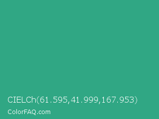 CIELCh 61.595,41.999,167.953 Color is a normal green color and the nearest color is Jungle Green #29ab87. Hex code #30a784 and RGB value is rgb(48,167,132). In RGB color space, this color is composed of 19% red, 65% green, 52% blue, In CMYK color space, this color is composed of 71% cyan, 0% magenta, 21% yellow , 35% black , In HSL color space, this color has a hue angle of 162° , 55% saturation and 42% lightness.