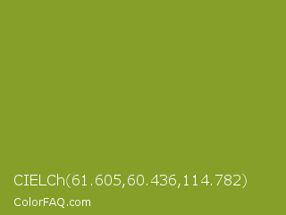 CIELCh 61.605,60.436,114.782 Color is a normal lime color and the nearest color is Sushi #87ab39. Hex code #859f29 and RGB value is rgb(133,159,41). In RGB color space, this color is composed of 52% red, 62% green, 16% blue, In CMYK color space, this color is composed of 16% cyan, 0% magenta, 74% yellow , 38% black , In HSL color space, this color has a hue angle of 73° , 59% saturation and 39% lightness.