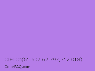 CIELCh 61.607,62.797,312.018 Color is a light purple color and the nearest color is Lavender #b57edc. Hex code #b47ce8 and RGB value is rgb(180,124,232). In RGB color space, this color is composed of 71% red, 49% green, 91% blue, In CMYK color space, this color is composed of 22% cyan, 47% magenta, 0% yellow , 9% black , In HSL color space, this color has a hue angle of 271° , 70% saturation and 70% lightness.