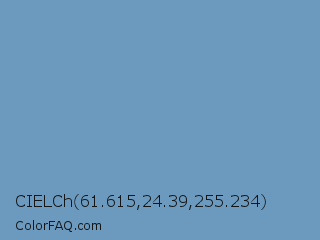 CIELCh 61.615,24.39,255.234 Color is a normal blue color and the nearest color is Cerulean Frost #6d9bc3. Hex code #6b9abe and RGB value is rgb(107,154,190). In RGB color space, this color is composed of 42% red, 60% green, 75% blue, In CMYK color space, this color is composed of 44% cyan, 19% magenta, 0% yellow , 25% black , In HSL color space, this color has a hue angle of 206° , 39% saturation and 58% lightness.